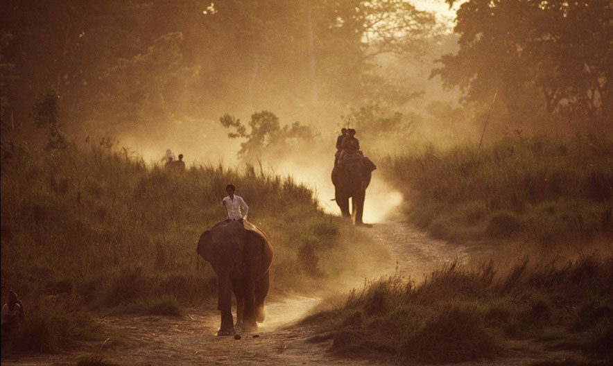Nepal: Elephants and mahouts taking their animals to the river at sunset in order to bathe. These elephants are used a tour vehicles to watch rhinos and tigers in Chitwan National Park.