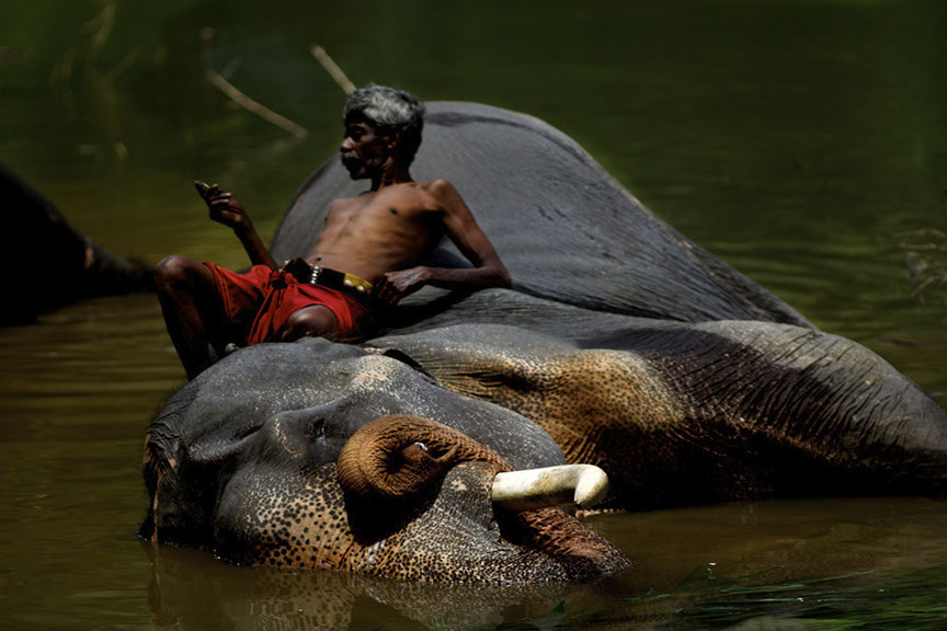 Kandy, Sri Lanka. A mahout takes a time out from washing his beast. Actually, they are both taking a time out.
