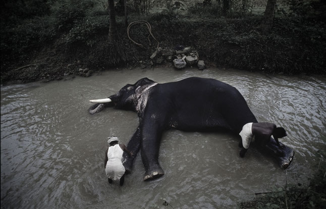 Sri Lanka. The elephant is taking an afternoon snooze and keeping cool at the same time.